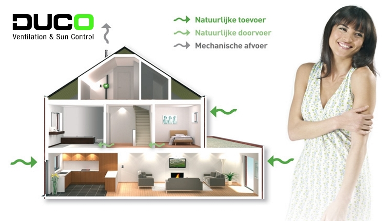 Er bestaan 4 verschillende ventilatiesystemen die zich onderscheiden op basis van de manier waarop ze de lucht gaan toe- of afvoeren. Het toe- en afvoeren van lucht kan op natuurlijke of mechanische wijze gebeuren. De natuurlijke toevoer gebeurt via regelbare roosters in ramen of muren in de droge ruimtes. De natuurlijke afvoer wordt geregeld via roosters in de natte ruimtes of verticale kanalen tot boven de daknok. Bij mechanische toevoer stuurt een ventilator de lucht via een kanalensysteem de woning binnen. Bij mechanische afvoer zuigt een ventilator de vervuilde lucht in de natte ruimtes af en stuurt ze via een kanalensysteem naar buiten. De doorstroom tussen de verschillende ruimtes gebeurt via doorstroomopeningen in binnendeuren en -muren.SM.Duco.09.12_WEB_nl