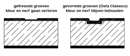 Vooral bij deurpanelen met houtstructuurfolies zoals Renolit en Hornschuch, is dit visueel niet altijd een geslaagde combinatie. Vaak zie je Gouden eik of Nussbaum panelen met gelakte bruine lijnen, wat enorm opvalt. Ook verkrijg je een product verzwakking wanneer een groef in een plaat wordt gefreesd. Wanneer je in een PVC plaat van 2 mm dik, lijnen van 1 mm diepte gaat frezen, is dit altijd een zwakke plaats om later te scheuren.