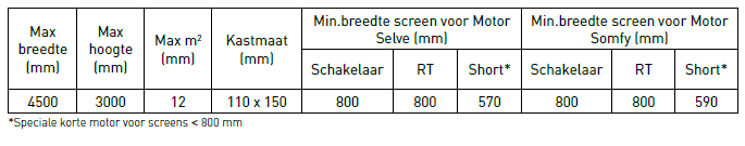 De maximumbreedte van de screen is 4.500mm, maximumhoogte is 3.000mm. Met de inbouwscreen kunnen we een oppervlakte van maximum 12m² coveren.